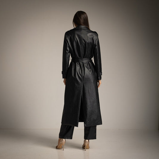 Longline Faux Leather Trench Coat in Black