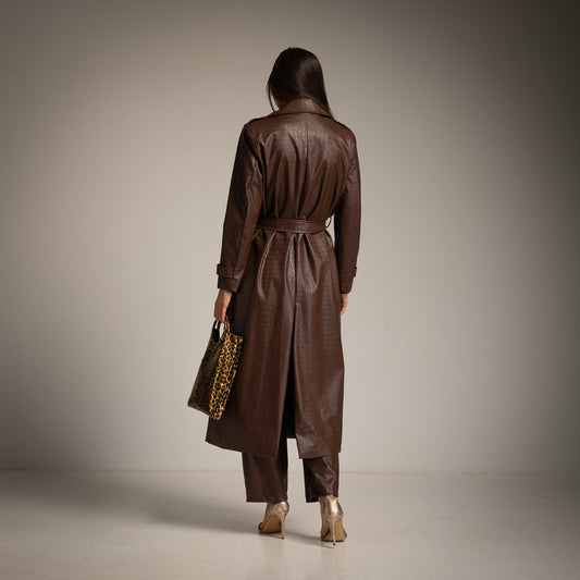 Longline Faux Leather Trench Coat in Brown