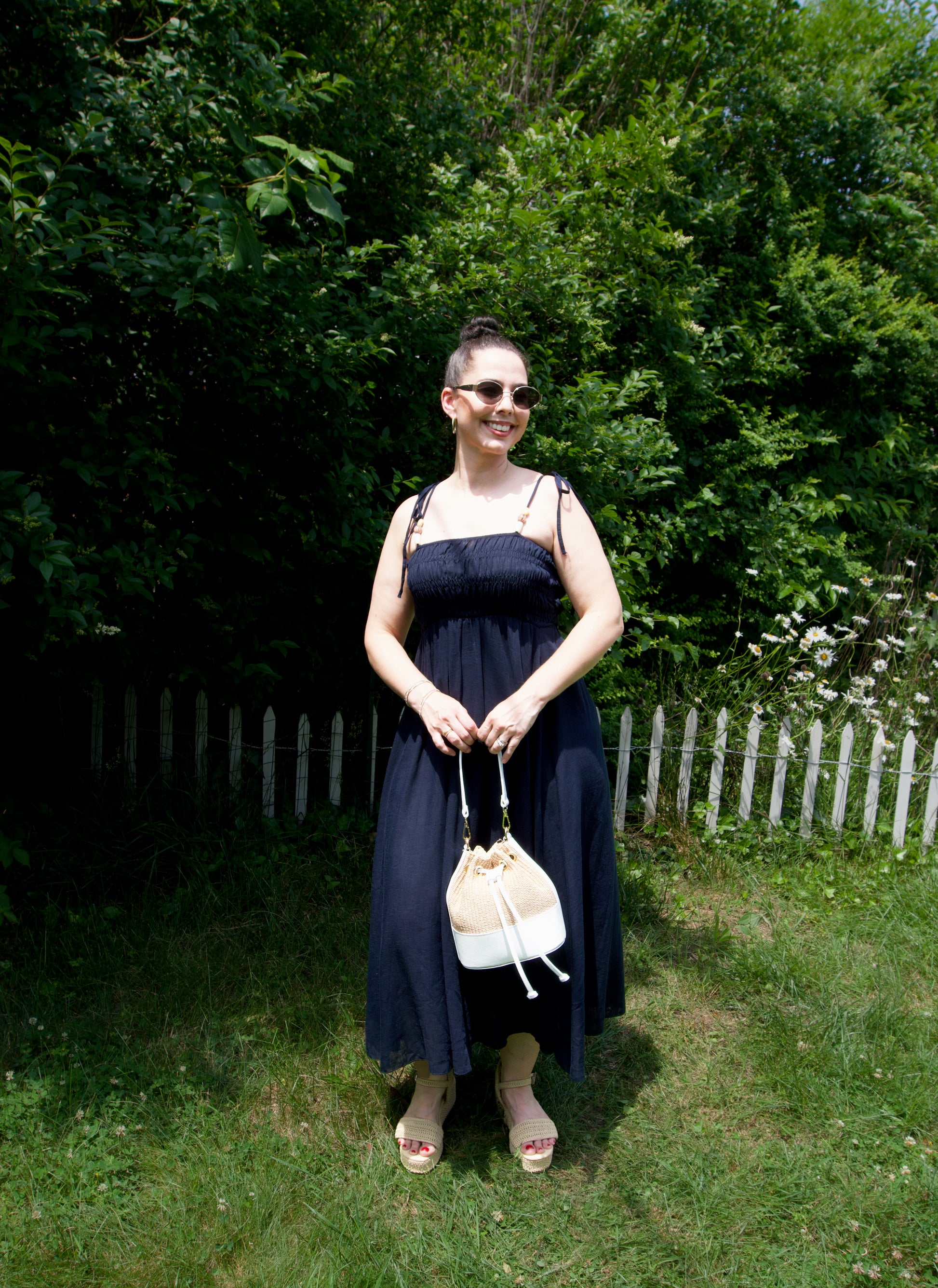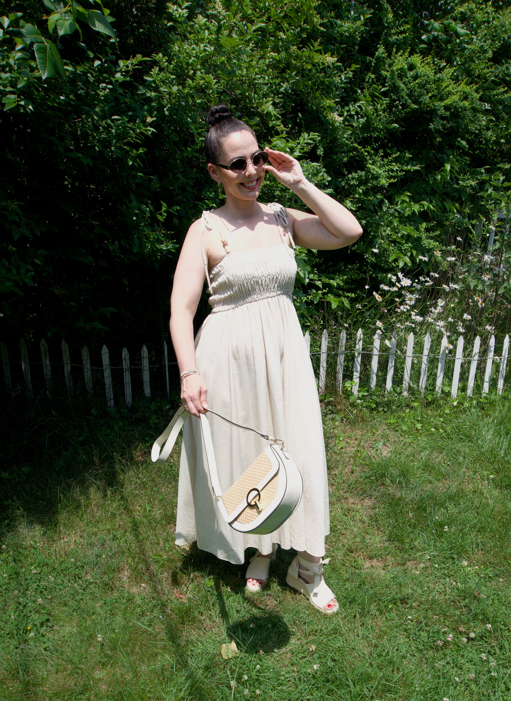 Beaded Tie Tank Smocked Bodice Dress Linen Blend